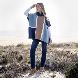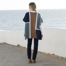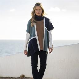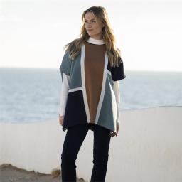 This relaxed cape jumper brings contemporary flair with its striking geometric block design. Made from a soft blend of 68% cotton and 32% polyamide, it drapes beautifully and feels comfortable against the skin. The open, poncho-style cut with wide sleeves and a loose fit makes it perfect for layering over shirts or tops.