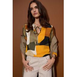 Stunning style with effortless charm. Tailored in a recycled flowy satin fabric, this tunic displays a relaxed, yet classic straight silhouette with long cuffed sleeves. A striking abstract print adorns the garment, while the keyhole neckline with drawstring cord end detail maximizes the piece’s chic factor.