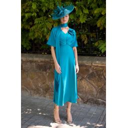 This mid length, A-line dress is a perfect example of understated elegance. Featuring a flattering V shaped neckline and cape style sleeves which add movement and shape, gathering under the bustline they create a flattering, high-waisted silhouette. The dress is finished with a flower detail on the neckline.