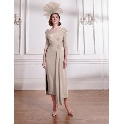A stunning combination of luxe sparkle fabric and tonal crepe, featuring a fitted underlayer with a flowing A-line overskirt. Beaded detailing at the waist adds a touch of elegance, while draped crepe falls gracefully down the front of the dress. The design is completed with an on-the-shoulder neckline and 3/4 sleeves for a sophisticated finish.