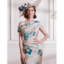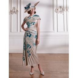 Modern and striking, this printed crepe dress features soft pleats that begin at the hip and fan elegantly across the skirt, creating a dynamic and flattering silhouette. The asymmetric neckline adds contemporary edge while enhancing the overall sculpted shape. Crafted to contour the body with refined movement, this style is a sophisticated choice for the Mother of the Bride or Groom seeking a polished yet memorable design.
