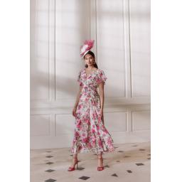 This printed chiffon dress is effortlessly feminine with a V-neckline and flutter sleeves that add movement and charm.
