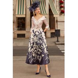 This beautiful mid length dress features three quarter length sleeves and a flattering v-neck neckline with fitted bodice. The full skirt features a contrasting, two tone print and is finished with a statement floral embelishment at the waist